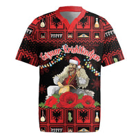 Personalized Albania Christmas Rugby Jersey Albanian Man Playing Lahuta With Red Poppy