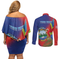 Personalized Costa Rica Independence Day Couples Matching Off Shoulder Short Dress and Long Sleeve Button Shirt Scarlet Macaw Parrot With Coat Of Arms