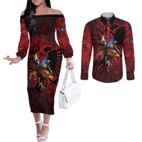Personalized Kosova Albanian Roots Couples Matching Off The Shoulder Long Sleeve Dress and Long Sleeve Button Shirt Kosova Albanian Eagle Flag