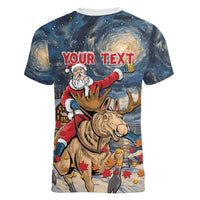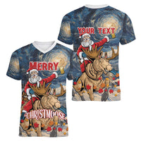 Personalized Merry Christmoose Women V-Neck T-Shirt Santa Claus Riding Moose Starry Night
