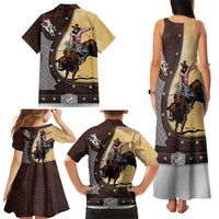 Celebrate Togetherness in Style: Elevate family moments with our Bull Riding Family Matching Tank Maxi Dress and Hawaiian Shirt Cowboy Courage Rodeo Family Matching Tank Maxi Dress and Hawaiian Shirt Set. Designed for families, couples, or friends, this vibrant matching ensemble is perfect for showcasing unity during summer outings, vacations, or special events.