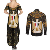 Pharaoh King Tut Egypt Couples Matching Summer Maxi Dress and Long Sleeve Button Shirt with Hieroglyphic Gold Pattern