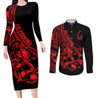 Polynesia Couples Matching Long Sleeve Bodycon Dress and Long Sleeve Button Shirts Fish Hook Tattoo Go Fishing Polynesian Pattern Red