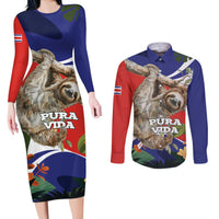 Pura Vida Costa Rica Sloth Couples Matching Long Sleeve Bodycon Dress and Long Sleeve Button Shirt Tropical Flowers Flag Color