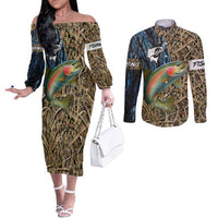 Rainbow Trout Fishing Couples Matching Off The Shoulder Long Sleeve Dress and Long Sleeve Button Shirt with Camouflage Reeds and Forest Background in Nature-Inspired Colors TS04