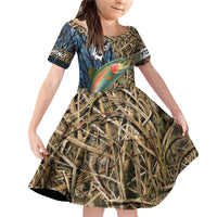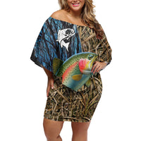 Rainbow Trout Fishing Family Matching Off Shoulder Short Dress and Hawaiian Shirt with Camouflage Reeds and Forest Background in Nature-Inspired Colors TS04