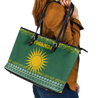 Rwanda Christmas Leather Tote Bag with Green-Yellow Pattern, National Emblem, and Radiant Sun Motif