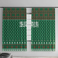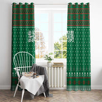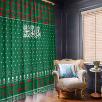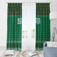 Saudi Arabia Christmas Window Curtain with Green Pattern, Traditional Script Motif, and Camel Caravan Silhouette