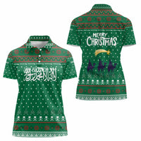 Saudi Arabia Christmas Women Polo Shirt with Green Pattern, Traditional Script Motif, and Camel Caravan Silhouette