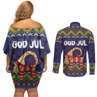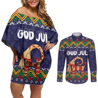 Scandinavian Yule Goat Christmas Couples Matching Off Shoulder Short Dress and Long Sleeve Button Shirt with Scandinavian Folk Pattern Style