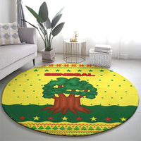 Senegal Christmas Round Carpet with Yellow-Green-Red Design, Baobab Tree, and National Coat of Arms Motif
