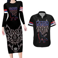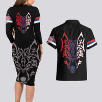 Serbia Couples Matching Long Sleeve Bodycon Dress and Hawaiian Shirt with Wolf Head Graphic, Howling Wolf, and National Flag Stripes TS04