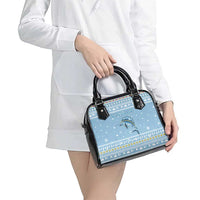 Seychelles Christmas Shoulder Handbag with Ocean Blue Pattern, Marlin Fish Artwork, and Surfing Santa Motif