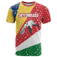 Seychelles Christmas T Shirt with Flag Colors Pattern, Tropical Bird Motif, and National Coat of Arms