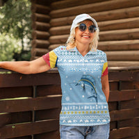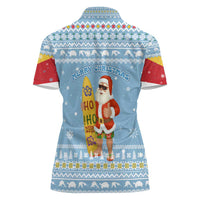 Seychelles Christmas Women Polo Shirt with Ocean Blue Pattern, Marlin Fish Artwork, and Surfing Santa Motif