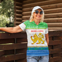 Sierra Leone Christmas Women Polo Shirt with Festive Green Pattern, Golden Lion Emblem, and Santa Sleigh Motif