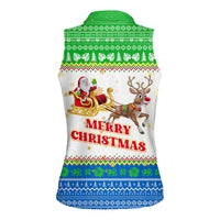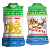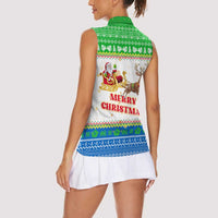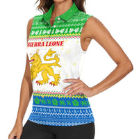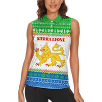 Sierra Leone Christmas Women Sleeveless Polo Shirt with Festive Green Pattern, Golden Lion Emblem, and Santa Sleigh Motif