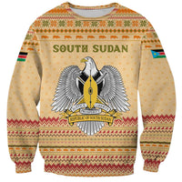 South Sudan Christmas Sweatshirt with Beige Tribal Pattern, National Emblem, and Green Star Motif