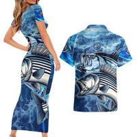Striped Bass Fishing Couples Matching Short Sleeve Bodycon Dress and Hawaiian Shirt Ocean Waves DT02