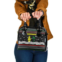 Suriname Christmas Shoulder Handbag with Black Festive Pattern, Golden Ship, Palm Tree, and Coat of Arms Motif