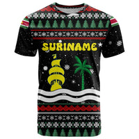Suriname Christmas T Shirt with Black Festive Pattern, Golden Ship, Palm Tree, and Coat of Arms Motif