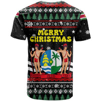 Suriname Christmas T Shirt with Black Festive Pattern, Golden Ship, Palm Tree, and Coat of Arms Motif TS04