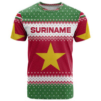 Suriname Christmas T Shirt with Red-Green Knit Pattern, Yellow Star, and Santa Leopard Motif