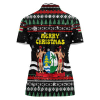 Suriname Christmas Women Polo Shirt with Black Festive Pattern, Golden Ship, Palm Tree, and Coat of Arms Motif TS04