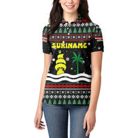 Suriname Christmas Women Polo Shirt with Black Festive Pattern, Golden Ship, Palm Tree, and Coat of Arms Motif