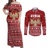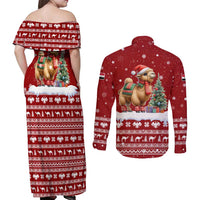 Syria Christmas Couples Matching Off Shoulder Maxi Dress and Long Sleeve Button Shirt with Golden Eagle Emblem Christmas Camel Scene TS04