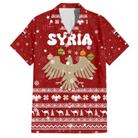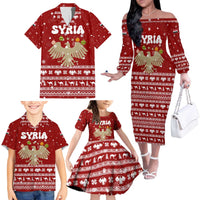 Syria Christmas Family Matching Off The Shoulder Long Sleeve Dress and Hawaiian Shirt with Golden Eagle Emblem Christmas Camel Scene