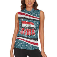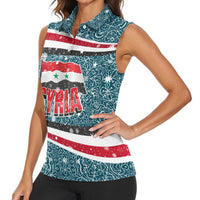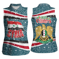 Syria Christmas Women Sleeveless Polo Shirt with National Flag Motif, Coat of Arms Eagle, and Festive Snowflake Pattern