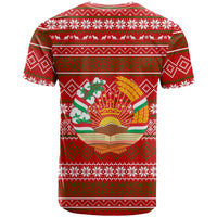 Tajikistan Christmas T Shirt with Santa Riding Snow Leopard National Emblem and Red Holiday Pattern TS04