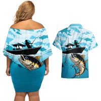 Tuna Fishing Couples Matching Off Shoulder Short Dress and Hawaiian Shirt Fish Camouflage Pattern