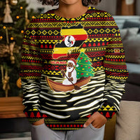 Uganda Christmas Kid Ugly Christmas Sweater with Santa in Canoe Christmas Tree Uganda Map Flag and Black Red Yellow Tribal Pattern Design