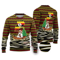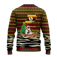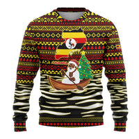 Uganda Christmas Ugly Christmas Sweater with Santa in Canoe Christmas Tree Uganda Map Flag and Black Red Yellow Tribal Pattern Design