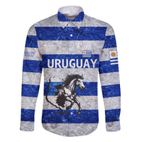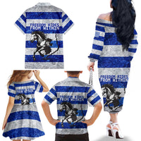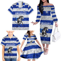 Uruguay Family Matching Off The Shoulder Long Sleeve Dress and Hawaiian Shirt with Wild Horse Illustration Blue Gray Striped