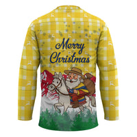 Score your own personalized Venezuela Christmas Hockey Jersey with Santa on Horse Traditional Outfit Snowflakes and Yellow Plaid from Wonder Print Shop today and wear your colors your way — on or off the ice.