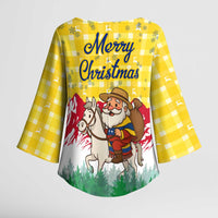 Step into effortless style with the Venezuela Christmas Kimono Sleeve Blouse with Santa on Horse Traditional Outfit Snowflakes and Yellow Plaid by Wonder Print Shop. Perfect for work, brunch, or a casual night out.
