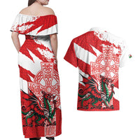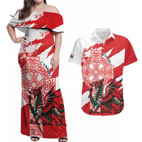 Wales Celtic Cross Couples Matching Off Shoulder Maxi Dress and Hawaiian Shirt Cymru Am Byth Red Version