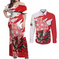 Wales Celtic Cross Couples Matching Off Shoulder Maxi Dress and Long Sleeve Button Shirt Cymru Am Byth Red Version