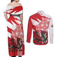 Wales Celtic Cross Couples Matching Off Shoulder Maxi Dress and Long Sleeve Button Shirt Cymru Am Byth Red Version LT18