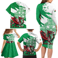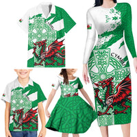 Wales Celtic Cross Family Matching Long Sleeve Bodycon Dress and Hawaiian Shirt Cymru Am Byth Green Version LT18