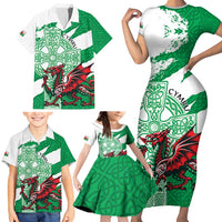 Wales Celtic Cross Family Matching Short Sleeve Bodycon Dress and Hawaiian Shirt Cymru Am Byth Green Version
