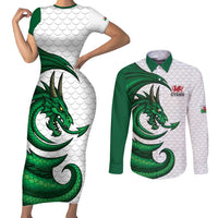 Wales Celtic Dragon Couples Matching Short Sleeve Bodycon Dress and Long Sleeve Button Shirt Welsh Mythic Green Dragon