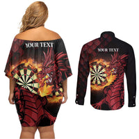Wales Darts Personalised Couples Matching Off Shoulder Short Dress and Long Sleeve Button Shirt Red Dragon Cymru Am Byth
