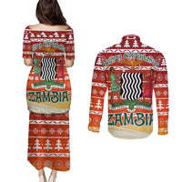 Zambia Christmas Couples Matching Puletasi and Long Sleeve Button Shirt with African Animals Tree Snowflakes and National Emblem Design